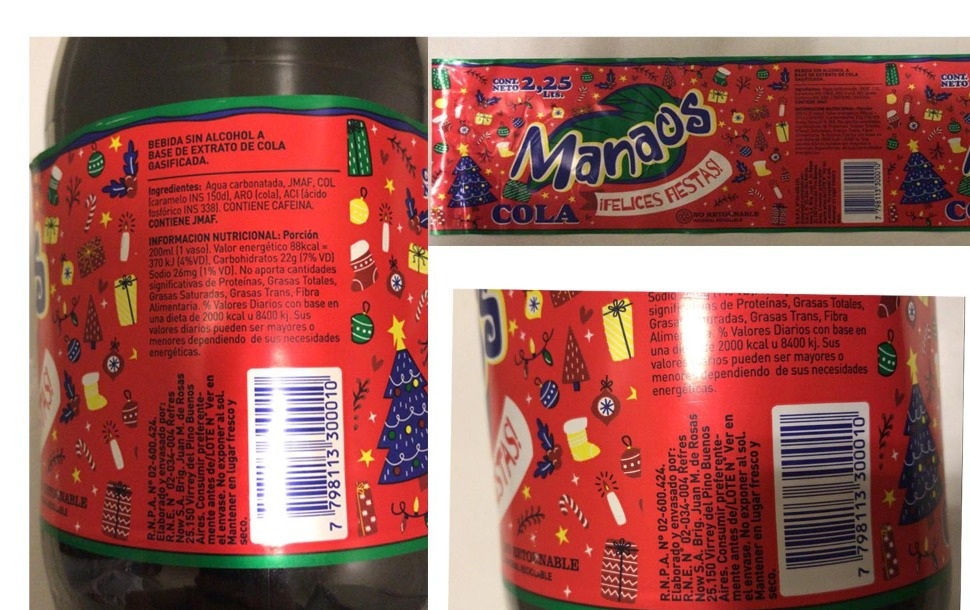 Las características de la misma son las siguientes: Bebida sin alcohol a base de extractos de cola gasificada, contenido neto: 2,25 lt, marca Manaos - Felices Fiestas, RNPA N° 02-600424, RNE N° 02- 034004.
