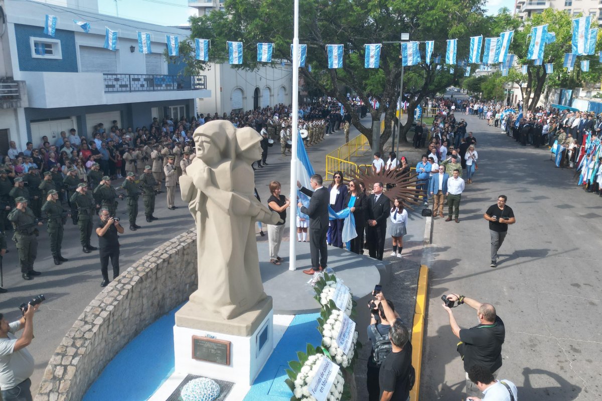 Luego, se realizó el izamiento de la bandera nacional en el Mástil Mayor, acompañado por un profundo silencio y respeto. Acto seguido, se entonó el Himno Nacional Argentino, interpretado por la Banda Militar "Tambor de Tacuarí" del Batallón de Ingenieros Blindados 2, seguido de la Marcha a Entre Ríos, que resonó con orgullo en la plaza.