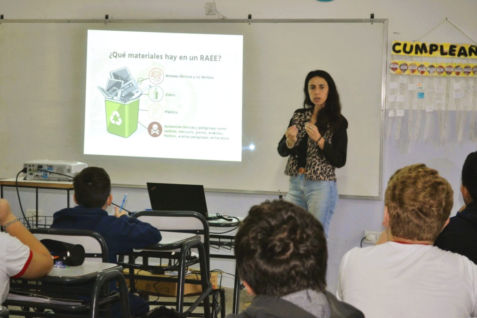 Este jueves 8 de mayo, la encargada del área de Ambiente, Pierina Rodríguez, dió una charla a alumnos de 1º año de la Escuela Técnica “Gral. Manuel N. Savio”, sobre el tratamiento adecuado para los Residuos de Artefactos Eléctricos y Electrónicos (RAEE).