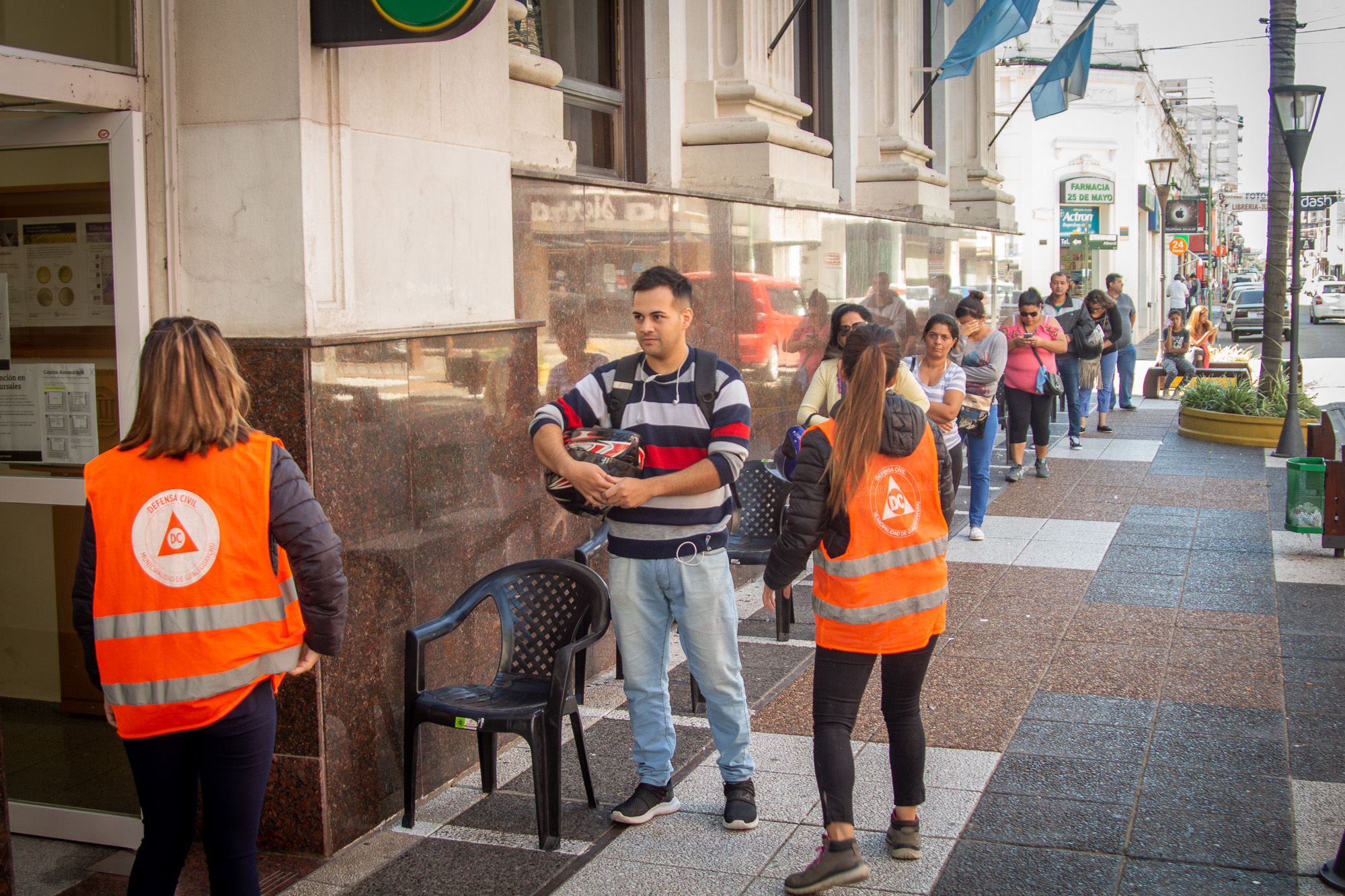 Con el objetivo de ordenar el ingreso y la concurrencia de vecinos y vecinas a los bancos de la ciudad, el municipio dispuso personal de Defensa Civil, Tránsito y sillas para hacer más llevadera la espera.