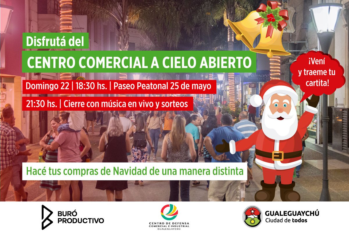 En el marco de las fiestas de fin de año, se realizará una nueva jornada del Centro Comercial a Cielo Abierto. El centro de la ciudad se transformará en un gran paseo peatonal, donde se podrá disfrutar de promociones, sorteos y show en vivo. Además, habrá un Papá Noel para que los niños y las niñas le acerquen su cartita.